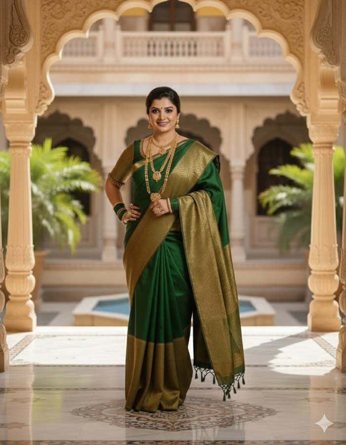 Featuring an elegant zari border inspired by temple architecture, this saree blends heritage craftsmanship with modern refinement.